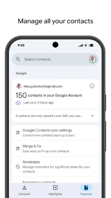 صرف حفاظت ہی نہیں، ہماری ایپ آپ کے رابطوں کو منظم رکھنے اور انہیں تازہ ترین حالت میں رکھنے میں بھی بے مثال مدد فراہم کرتی ہے۔ آپ اپنے رابطوں کو آسانی سے مختلف اکاؤنٹس جیسے کام یا ذاتی بنیاد پر دیکھ سکتے ہیں، جس سے آپ کو ایک منظم جھلک ملتی ہے۔ نئے رابطے شامل کرنا یا موجودہ معلومات جیسے فون نمبرز، ای میل ایڈریسز اور تصاویر میں ترمیم کرنا اب پہلے سے کہیں زیادہ آسان ہے۔ اس کے علاوہ، یہ خودکار طور پر نقلی رابطوں کو ضم کرنے، مفید تفصیلات شامل کرنے اور آپ کی فہرست کو بے داغ رکھنے میں بھی آپ کی رہنمائی کرتی ہے۔