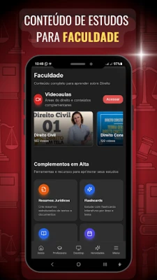 "Direito" میں ایسی خصوصیات موجود ہیں جو آپ کے سیکھنے کے تجربے کو مکمل طور پر بدل دیں گی۔ ہماری 'قانونی کتابوں کی شیلف' آپ کو قانون کے تمام شعبوں کا احاطہ کرنے والی 500 سے زیادہ اہم کتابوں تک رسائی دیتی ہے۔ معروف ماہرین کی 'آن لائن ویڈیو کلاسز' اور 'آڈیو لیکچرز' کے ذریعے، آپ کہیں بھی، کبھی بھی اپنی تعلیم جاری رکھ سکتے ہیں۔ پیچیدہ تصورات کو آسانی سے سمجھنے کے لیے 'ذہنی نقشے' اور قانونی اصولوں کو تفریحی انداز میں سیکھنے کے لیے 'قانونی کھیل' بھی دستیاب ہیں، تاکہ سیکھنا کبھی بورنگ نہ ہو۔