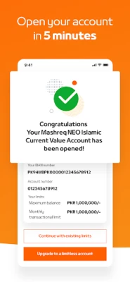صرف 5 منٹ میں، بغیر کسی کاغذی کارروائی یا بینک شاخ کے دورے کے، اپنا ڈیجیٹل اکاؤنٹ کھولیں۔ بچت اور کرنٹ اکاؤنٹس پر صنعت کی سب سے بہترین منافع کی شرحوں سے مستفید ہوں۔ مشرق آپ کو مکمل طور پر شریعہ کے مطابق ڈیجیٹل حل پیش کرتا ہے، جو آپ کی اقدار کے مطابق تیار کیے گئے ہیں۔ روزانہ 10 ملین پاکستانی روپے تک کی رقم آسانی سے منتقل کریں، ڈیبٹ کارڈ کے لیے درخواست دیں، اور 4000 سے زائد بلرز کو بغیر کسی رکاوٹ کے ادائیگی کریں۔ ملک بھر میں پھیلے 19,000 اے ٹی ایمز سے بلا معاوضہ نقد رقم نکالیں، اور اپنے ڈیٹا کے لیے اعلیٰ ترین خفیہ کاری اور ڈیجیٹل تحفظ سے لطف اٹھائیں۔